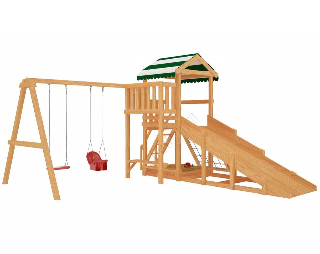 Поднявшись наверх можно поиграть на балкончике, с него будет открываться хороший вид на Ваш дачный участок. А быстро спуститься вниз малышам понравится с горки, цвет пластика на выбор: красный, желтый, зеленый, синий. Под платформой расположена квадратная песочница со сторонами 129 см, где можно более спокойно провести время, а отдохнуть на деревянной лавочке.