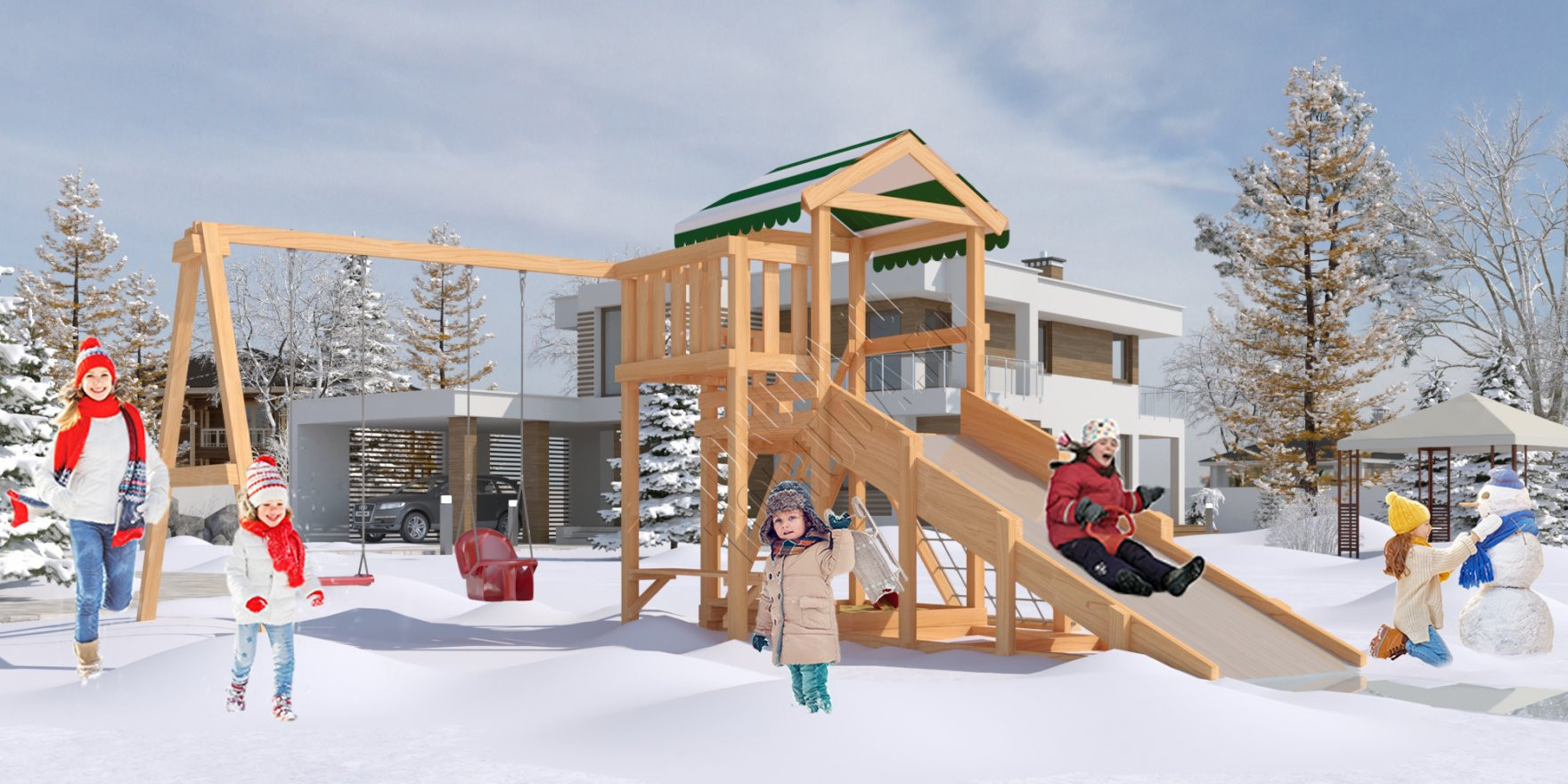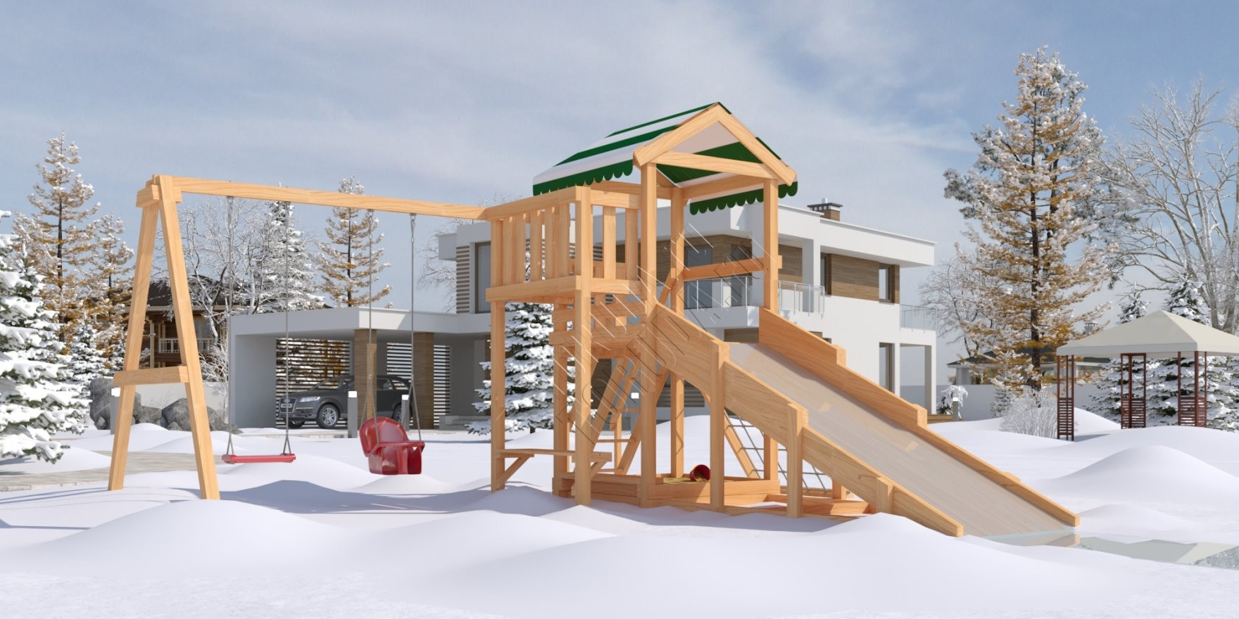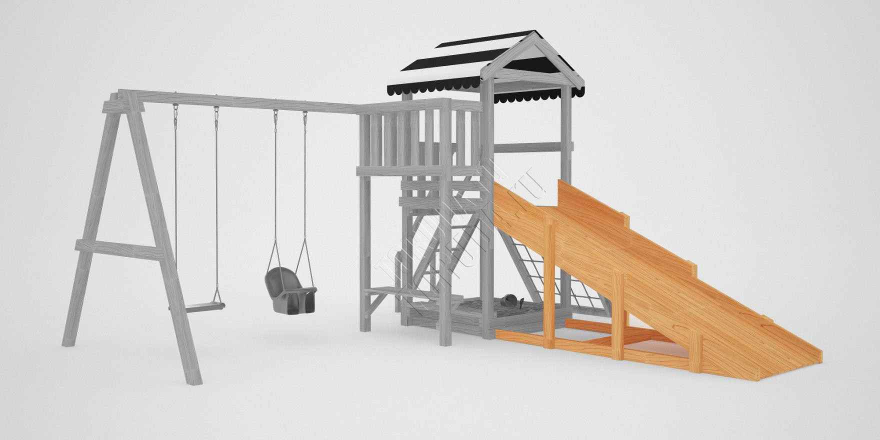 Сбоку к башне крепится качельная рама для двух элементов на выбор, например, качели «Лодочка» и «Люкс» со спинкой. Они очень нравятся как маленьким деткам, так и младшим школьникам.