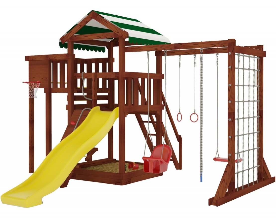 Укреплять мышечный каркас нужно с детства, бросая мяч в баскетбольное кольцо, вися на турнике и кольцах, карабкаясь по шведской стенке, канату, сетке-лазалке. Все это многообразие спортивных снарядов присутствует в Гарда 4 Бри. Для большей радости качели «Лодочка» и «Люкс» со спинкой.