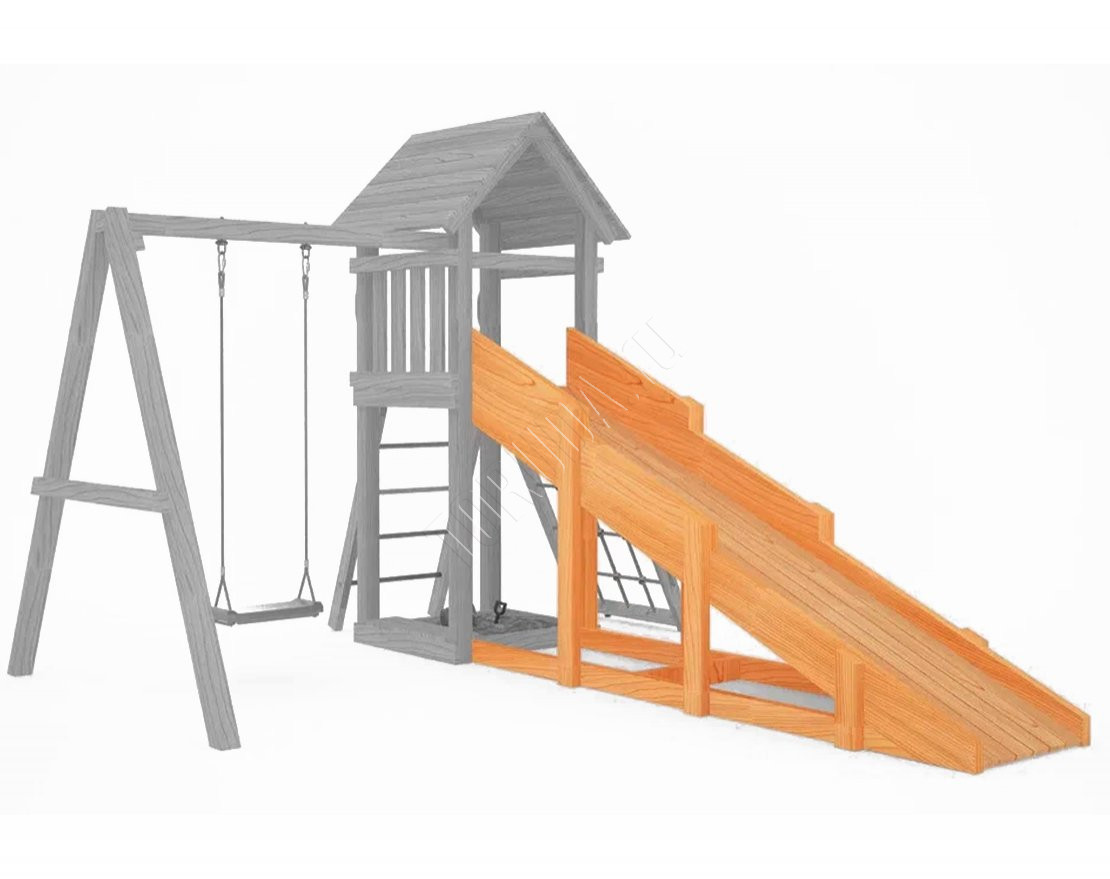 Площадка сохраняет геометрию рамы, содержит натуральные материалы, прошедшие сертификацию. Балки клееного бруса гладкие, острые края скруглены – отсутствие ран и ссадин важнее всего.