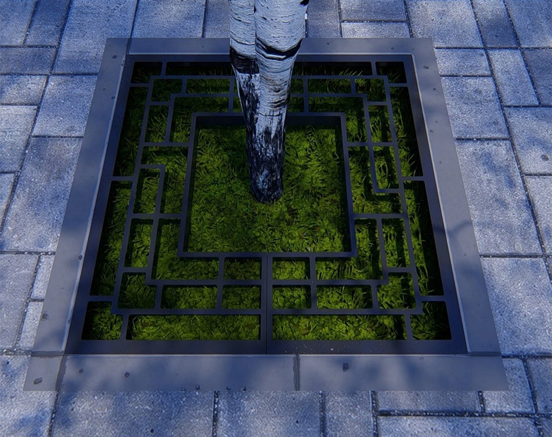 Красивая стальная приствольная решетка, защищающая корни деревьев, «Лабиринт» идеально смотрится на широких улицах городов, в скверах и парках. Подземная часть растения будет питаться водой, которую защита пропускает, но не будет повреждаться механическими и другими воздействиями. Сварная конструкция с узором, напоминающим лабиринт, станет украшением городского пространства. Изделие выполнено из листовой стали с применением лазерной резки.