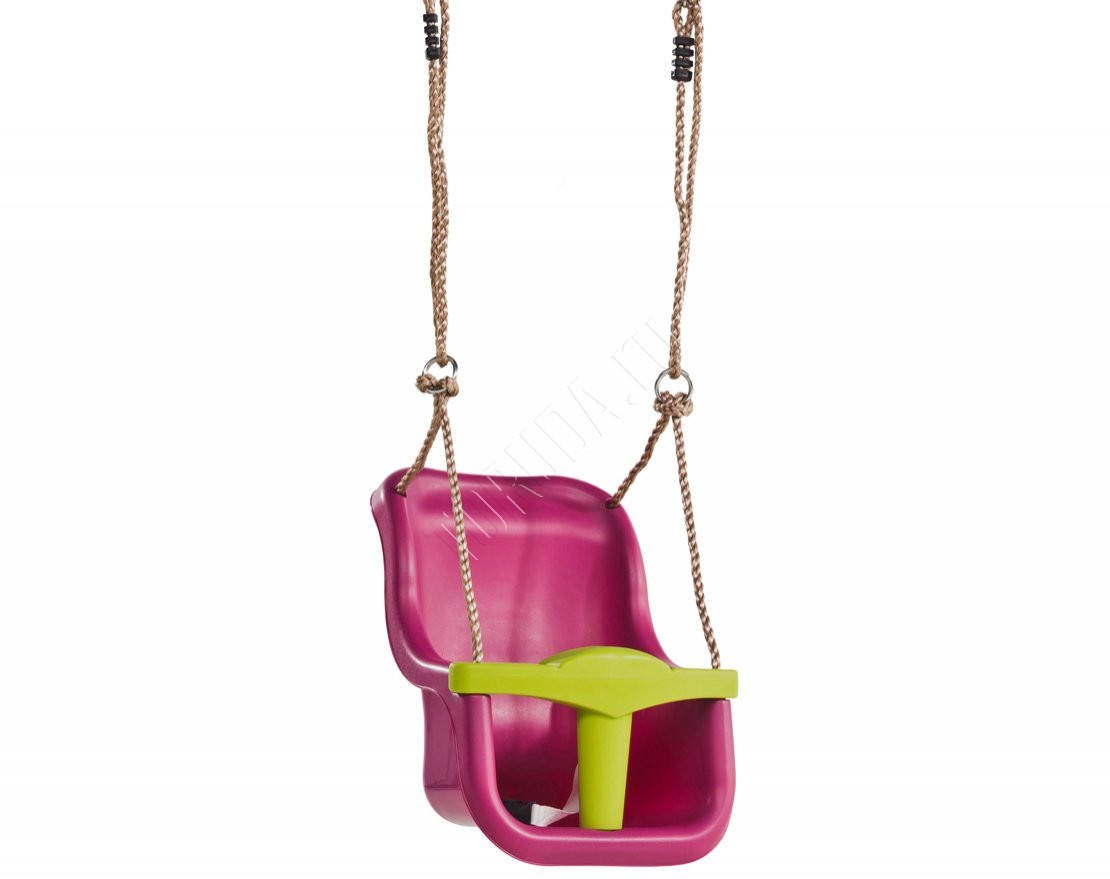 Качели оснащены снимающимся разделителем, который препятствует выпадению ребёнка, и ремнём безопасности.